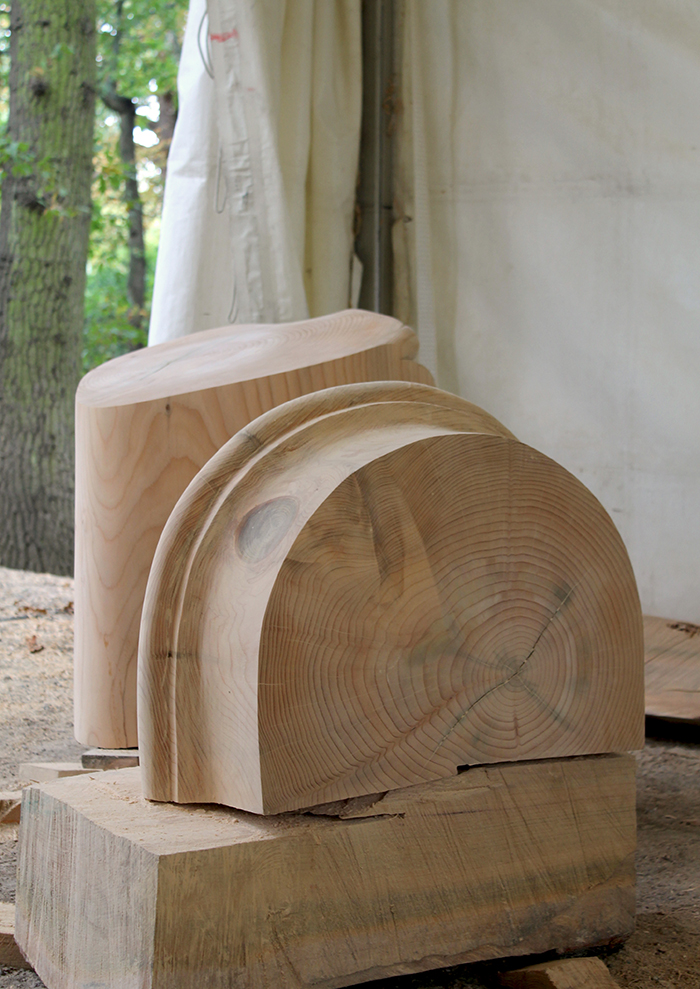 Le tronc évidé pointe en direction du socle vide, et l’usage de chaque bloc sculpté est laissé libre et ouvert à l’imagination du public.
