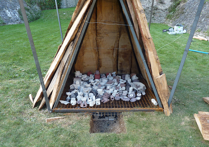 Dessin, fabrication et montage d'un four papier pour réaliser la cuisson d'environ 170 pièces en grès. Les coquetiers, boîtes à savon et sucriers ont été réalisés par des artistes, des designers, des enfants et des amateurs.